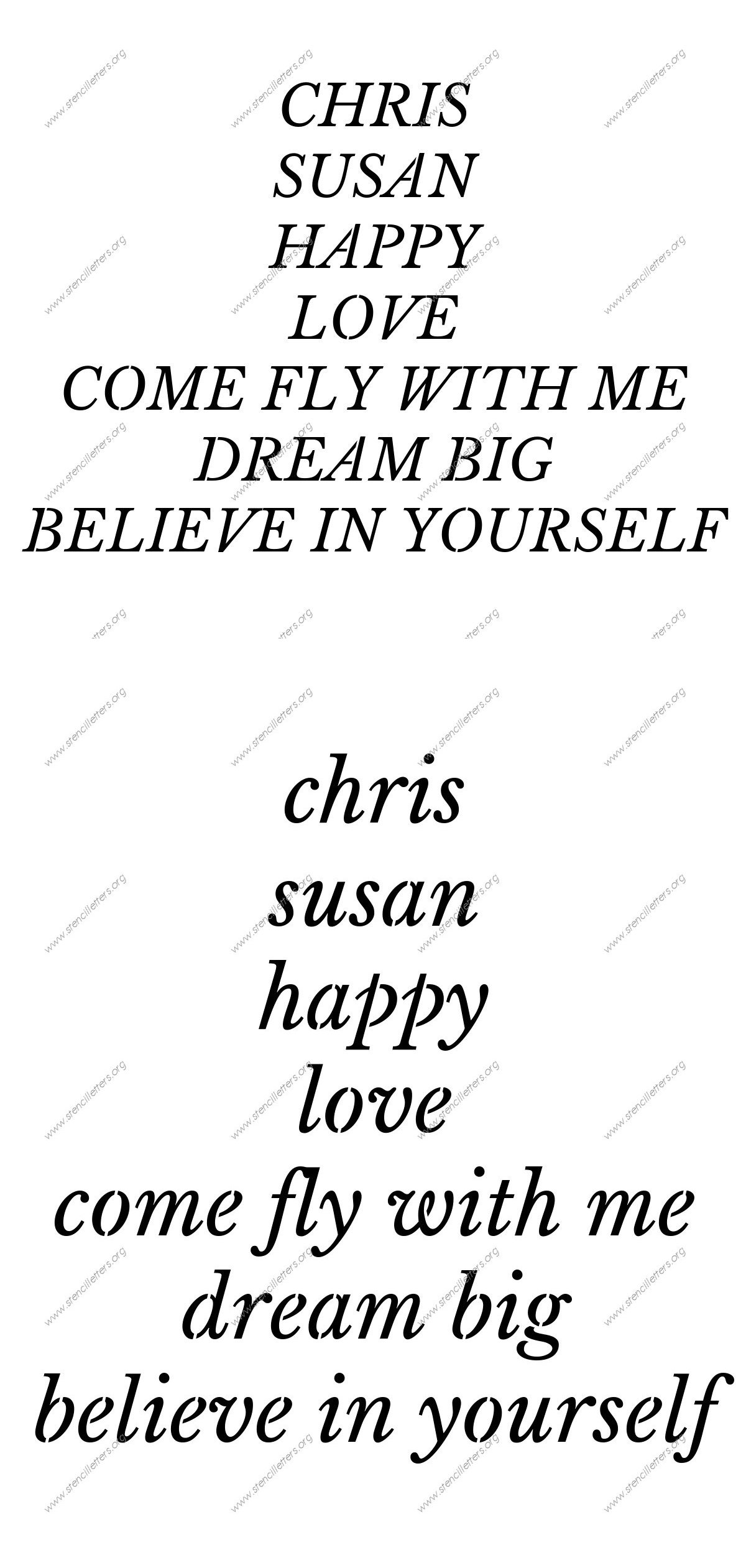 Roman Serif Italic Custom Template made to order stencils up to 36 inch Printable File Size. This Roman Serif Italic custom stencil design is from our selection of over 100 unique stencils listed in the {Custom Made Stencils} section.