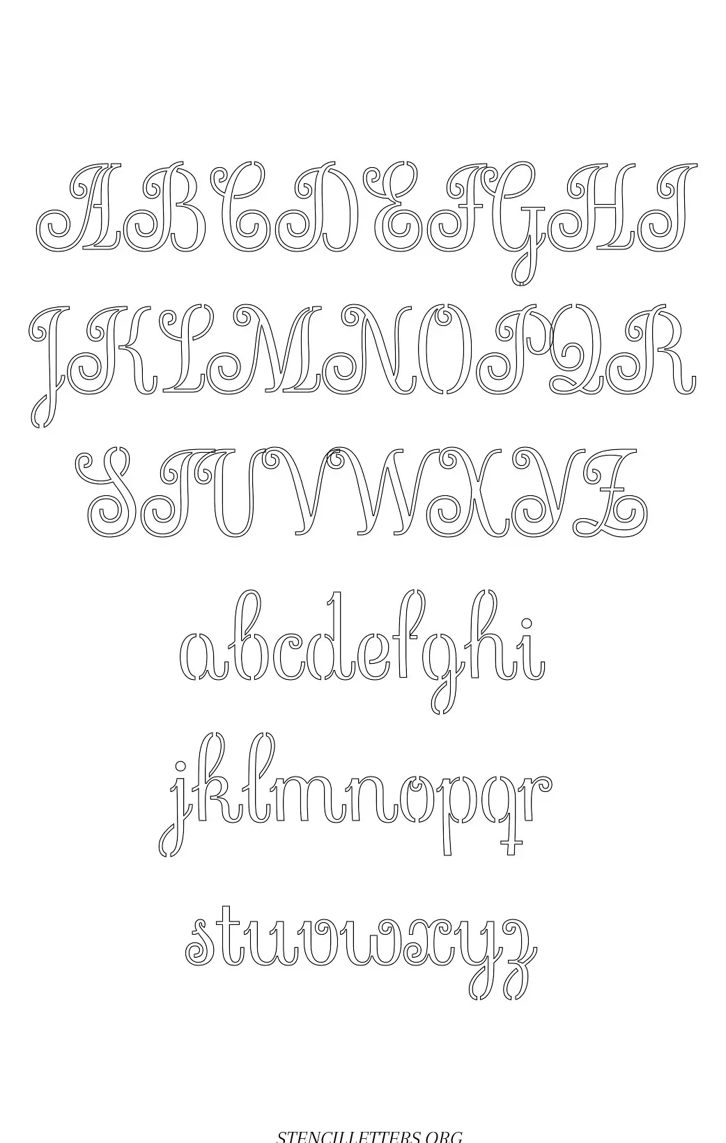 Exquisite Fine Cursive free printable letter stencils in uppercase and lowercase with outline cutout alphabet letters.